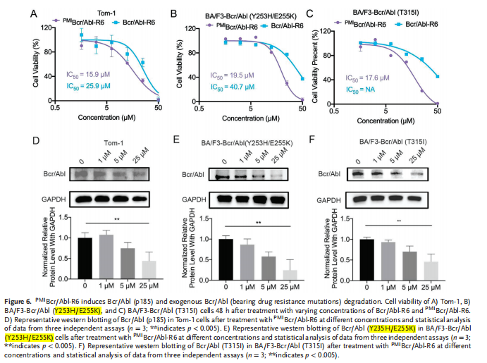 科佰生物為客戶提供了BCR-ABL1 [Y253H/E255K]/BaF3(貨號(hào)CBP73326)和BCR-ABL1 [T315I]/BaF3(貨號(hào)CBP73190)產(chǎn)品,幫助客戶在細(xì)胞活性測定中對其細(xì)胞活力測定,判斷PMIBcr/Abl-R6對細(xì)胞的殺傷能力和降解能力,通過對不同濃度的PMIBcr/Abl-R6處理的細(xì)胞系代表性蛋白印跡的測定與分析,從而助力研究過程中PMIBcr/Abl-R6誘導(dǎo)Bcr/Abl p185和外源性表達(dá)的Bcr/Abl攜帶耐藥性突變。