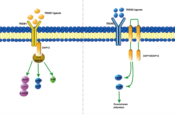 TREM(Triggering receptor expressed on myeloid cells)家族屬于細(xì)胞表面受體,介導(dǎo)調(diào)控炎癥反應(yīng)。TREM1屬于髓系細(xì)胞表面受體,在多種腫瘤微環(huán)境中均表達(dá),協(xié)同經(jīng)典的模式識別受體(PRR),例如Toll-like受體(TLR)家族和Nod-like受體(NLR)家族,在宿主防御中放大由微生物成分介導(dǎo)的炎癥反應(yīng),具有抗腫瘤的作用。TREM2(Triggering receptor expressed on myeloid cells-2)是免疫球蛋白超家族的跨膜受體,僅在中樞神經(jīng)系統(tǒng)(CNS)的小膠質(zhì)細(xì)胞等骨髓細(xì)胞中表達(dá)。TREM2有多種配體,主要有APOE, HDL, LDL以及Aβ等。TREM2通過其與接頭蛋白DAP12和DAP10的關(guān)聯(lián)發(fā)出信號。DAP12是參與先天免疫應(yīng)答的細(xì)胞中表達(dá)的信號傳導(dǎo)銜接蛋白,介導(dǎo)脾酪氨酸激酶SYK的激活,DAP12促進(jìn)質(zhì)膜上TREM2的穩(wěn)定,可以調(diào)控細(xì)胞的增殖,生存以及炎癥等信號通路。TREM2還可以結(jié)合DAP10,而DAP10通過招募磷脂酰肌醇3-激酶(PI3K)促進(jìn)信號傳導(dǎo)。