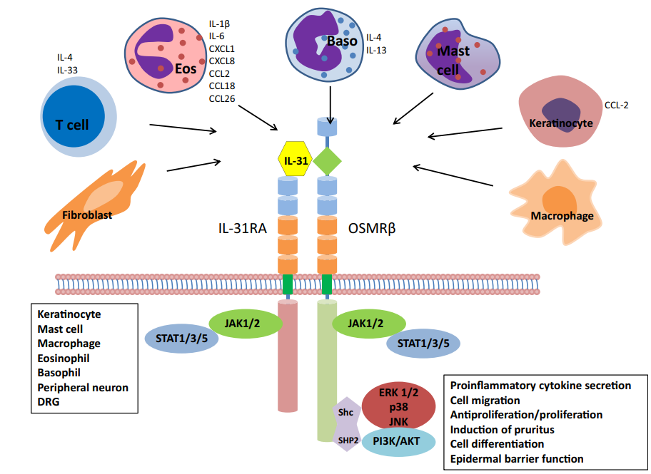IL-31(白細(xì)胞介素31)于2004年被Dillon等人發(fā)現(xiàn),是一種四螺旋束細(xì)胞因子,有2個(gè)長(zhǎng)螺旋和2個(gè)短螺旋,屬于糖蛋白130 (gp130)/IL-6細(xì)胞因子家族。IL-31最初被證明是由激活的輔助T細(xì)胞產(chǎn)生的,尤其是Th2細(xì)胞、肥大細(xì)胞、巨噬細(xì)胞和樹(shù)突狀細(xì)胞,此外在嗜酸性粒細(xì)胞、嗜堿性細(xì)胞等中也有IL-31的表達(dá)。IL-31與瘙癢感覺(jué)神經(jīng)纖維表面IL-31RA亞基結(jié)合,激活OSMR亞基發(fā)生異構(gòu),主要通過(guò)磷脂酰肌醇30-激酶/蛋白激酶(PI3K/AKT)通路、Janus激酶/信號(hào)轉(zhuǎn)換器和轉(zhuǎn)錄激活因子(JAK/STAT)通路及絲裂原激活的蛋白激酶(Ras/Raf/MAPK)通路。IL-31信號(hào)通路的下游轉(zhuǎn)錄因子的激活會(huì)參與不同的基因表達(dá),比如炎癥、遷移、分化、(抗)增殖、細(xì)胞存活和屏障功能等。