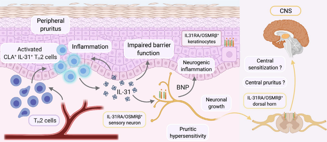 CLA T2細(xì)胞是特應(yīng)性皮炎(AD)患者循環(huán)中豐富的過(guò)敏原反應(yīng)性T細(xì)胞,通過(guò)CCL17和CCL22信號(hào)被募集到AD感染的皮膚。在皮膚中,CLA T2細(xì)胞分泌IL-31,進(jìn)而激活表達(dá)IL31RA/ OSMR β-的皮膚感覺(jué)神經(jīng)、天然免疫細(xì)胞(包括DC)、單核細(xì)胞和嗜酸性粒細(xì)胞以及角質(zhì)形成細(xì)胞。在AD皮膚中,角質(zhì)形成細(xì)胞顯示IL31RA/OSMRβ表達(dá)水平升高,導(dǎo)致對(duì)IL-31的接受性增強(qiáng)。皮膚IL-31信號(hào)通過(guò)IL-31介導(dǎo)的終分化基因(如聚絲蛋白和脂質(zhì)包膜減少)的抑制,導(dǎo)致外周瘙癢、(神經(jīng))炎癥和屏障功能受損。活化的角質(zhì)形成細(xì)胞分泌各種化學(xué)引誘劑,觸發(fā)表達(dá)IL -31的CLA Tu2細(xì)胞額外募集到炎癥部位,形成皮膚炎癥和瘙癢的反饋循環(huán)。人和犬的感覺(jué)神經(jīng)元表達(dá)IL31RA/ OSMRβ主要在TRPV1共表達(dá)的神經(jīng)元中。IL-31與IL31RA/ OSMR β結(jié)合后,通過(guò)下游信號(hào)通路上調(diào)瞬時(shí)受體電位香草酸受體1(tansient receptor potential vanilloid,TRPV1)及瞬時(shí)受體電位受體A1(TRPA1)表達(dá),增強(qiáng)神經(jīng)元興奮性,促進(jìn)晚期及慢性瘙癢形成。