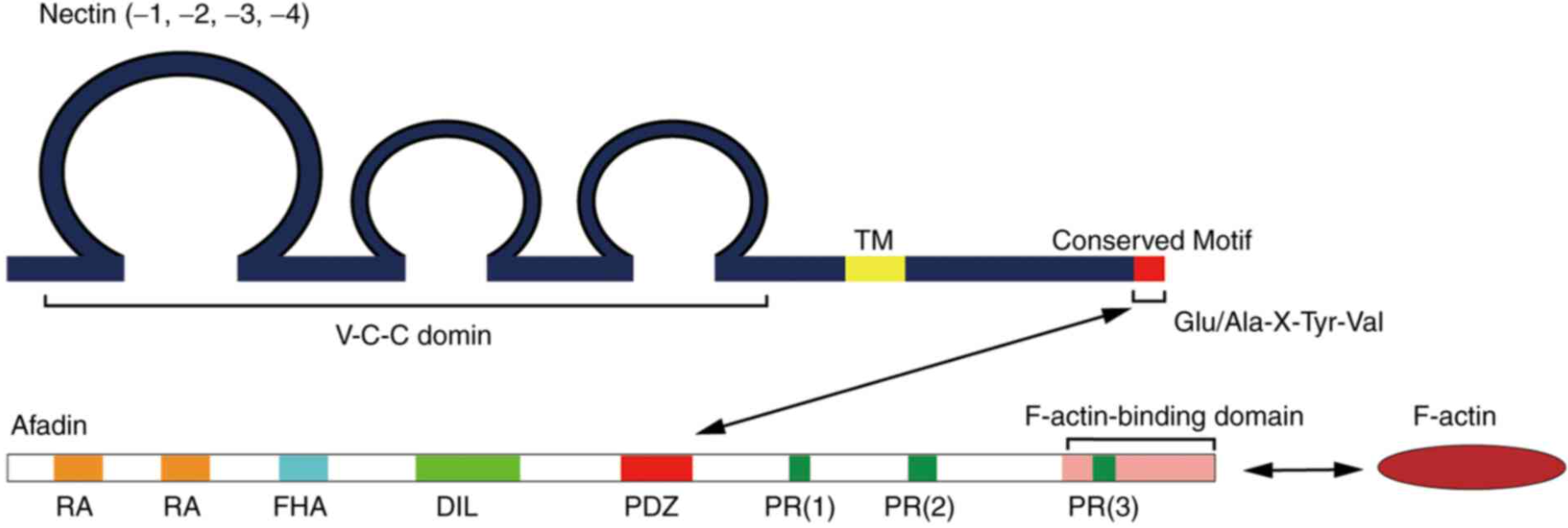 胞質(zhì)尾的C端都包含一個afadin (一種 F-肌動蛋白結合蛋白)結合基序,與Nectin-4不同的是,Nectin-1、Nectin-2、Nectin-3的afadin結合基序都是保守序列 Glu/Ala-X-Tyr-Val,可與 afadin的PDZ 結構域結合;而Nectin-4可通過其C末端的 Gly-His-Leu-Val 基序與銜接分子afadin結合。當Nectins與銜接分子afadin結合后,afadin會結合并募集絲狀肌動蛋白組件 (F-actin),從而促進細胞與細胞之間的粘附。Nectin家族與鈣黏著蛋白共同作用,對粘著連接和緊密連接的產(chǎn)生和維持具有顯著影響,它們調(diào)節(jié)多種細胞行為,包括細胞粘附、生長、分化、遷移和凋亡。