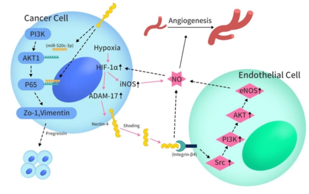 Nectin-4在正常的胚胎和胎兒組織中含量很高,但成年人的正常組織中通常表達較低,且在各種癌細胞上表達較高,比如宮頸癌、尿路上皮癌、乳腺癌、肺癌、胃癌、頭頸癌、胰腺癌等,主要通過激活PI3K/Akt途徑促進腫瘤細胞增殖、分化、遷移、侵襲等。