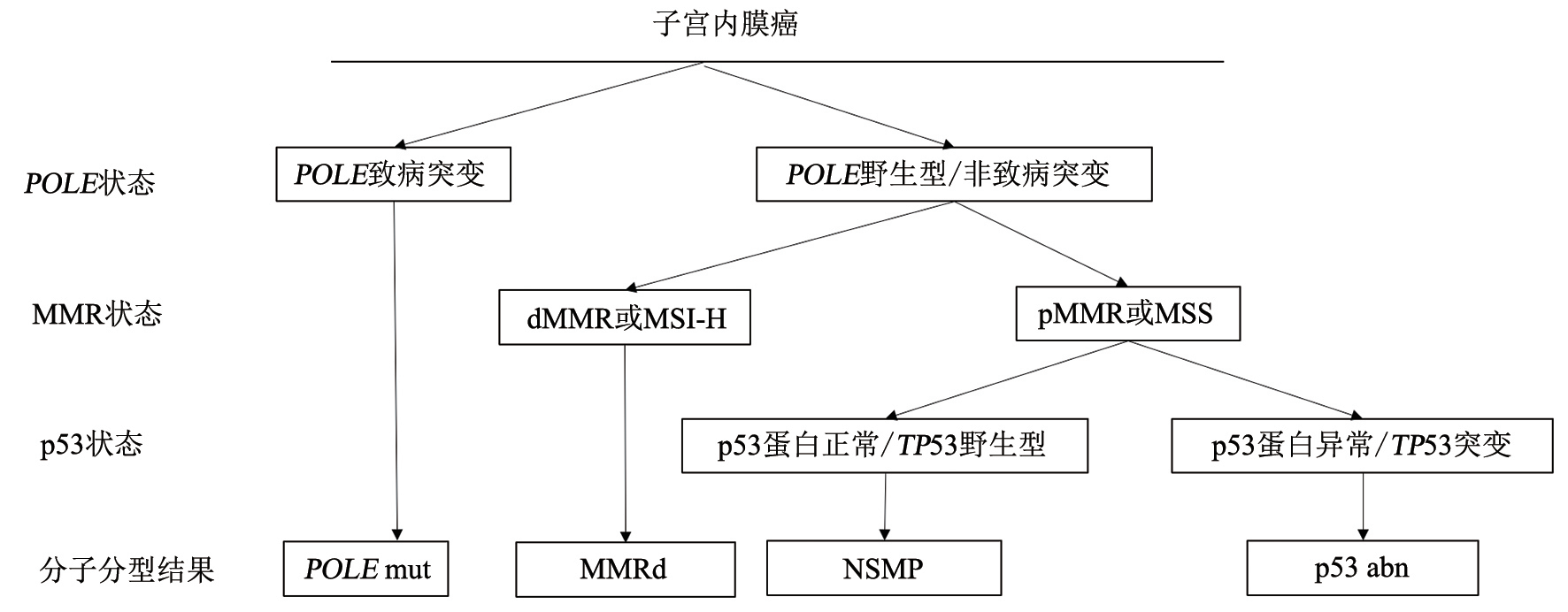 2013年美國癌癥基因組圖譜(TCGA),依據(jù)子宮內(nèi)膜癌全基因組、轉(zhuǎn)錄組、蛋白組等多組學(xué)檢測結(jié)果,將其分為POLE突變型、微衛(wèi)星不穩(wěn)定突變型、低拷貝數(shù)型和高拷貝數(shù)型等4種類型。2023年國際婦產(chǎn)科聯(lián)盟(International Federation of Gynecology and Obstetrics,F(xiàn)IGO)分期建議,所有的子宮內(nèi)膜癌EC患者均應(yīng)完善分子分型檢測。